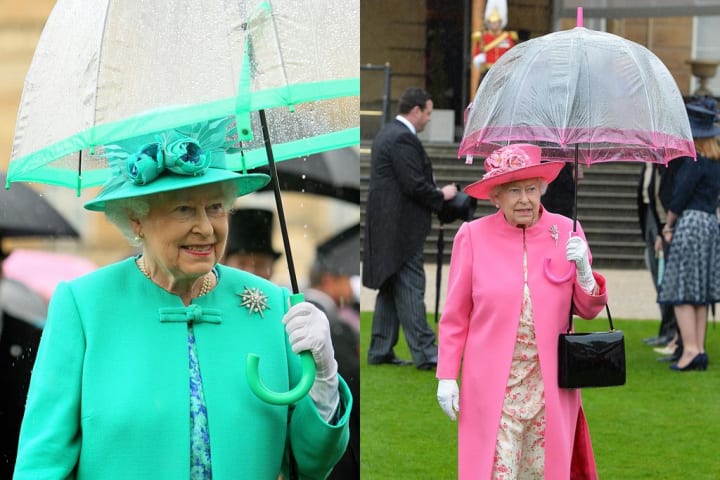 The monarch has waterproof umbrellas with the trim and handle that match the outfit she is wearing. They are clear so she can see and be seen when she carries them. Each of the transparent Fulton umbrellas costs $21.