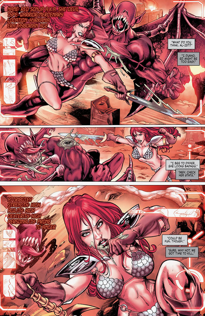 The interiors here are absolutely bloody gorgeous! My one complaint here is that we don’t get a proper montage of Sonja trying on clothes and seeing her in the outfit on the cover. The linework is so frakkin amazing and how we see the varying weights and techniques being utilised to create the level and quality of detail work that we see is utterly mindbogglingly wonderful. That we see backgrounds as much as we do thrills me with how they enhance the moments as well as work within the composition of the panels to bring us depth perception, sense of scale and the overall sense of size and scope to the story. The utilisation of the page layouts and how we see the angles and perspective in the panels show such a masterful eye for storytelling. The colour work we see is equally as bloody brilliant to see! How we see the various hues and tones within the colours being utilised to create the shading, highlights and shadow work shows a mastery of colour. I mean Pinky’s hair with how the light hits it and how it changes those hues is beyond brilliant. Everything we see from the light sources and angles and how the colour adds depth and complexity to what we see is so phenomenally rendered.