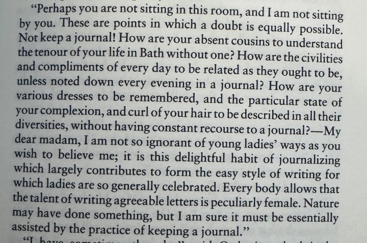 It's perhaps one of the reasons I love Catherine Morland - she knows who she is but she also has a deep, profound inner-life and personality. For example: she is able to hold her own against a man who argues about how she should write on him in her journal. She states that to suppose she doesn't have a journal. This sets him off into a rant about how women should have journals - something where Austen definitely puts in her own opinions about how women are naturally better writers than men. It is sneaky yes, and it completes the whole picture of power dynamics. But one thing that it does really well is it presents Catherine Morland's ability to pull the full explanation and answer out of whoever she is speaking to. This is done again when Isabella claims she has a letter from John Thorpe in which it states that Catherine has accepted John's romantic advances (this is obviously completely untrue, she has not).