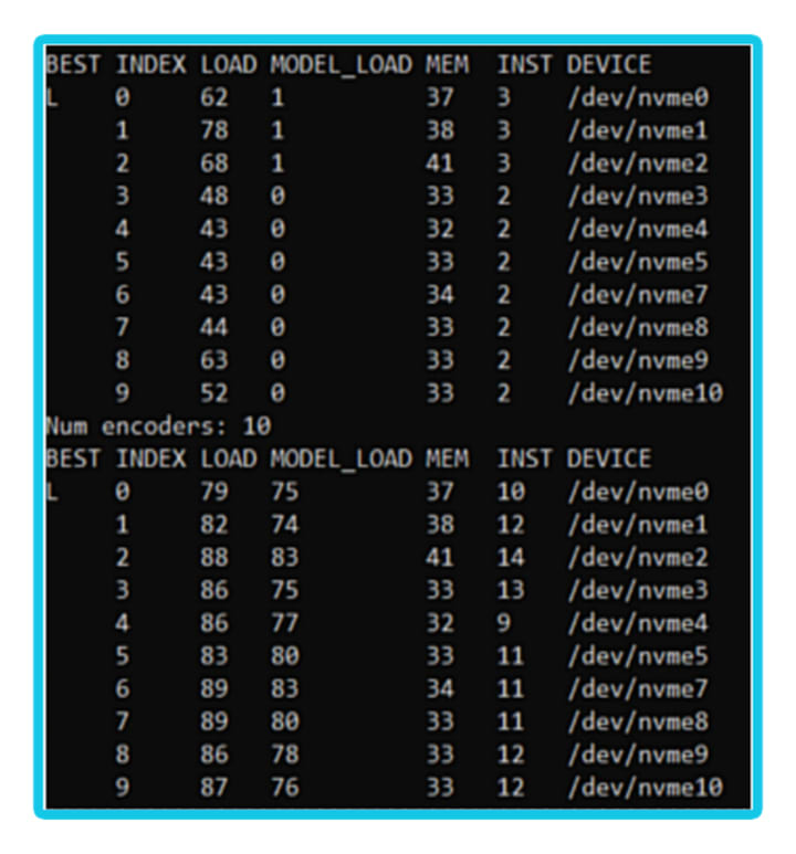 In this mode, users simply launch multiple transcoding jobs, and the device driver will automatically distribute the decode/encode tasking among the available resources. We used this mode of automatic distribution to produce the 23 ladders reported for the T408-based system.