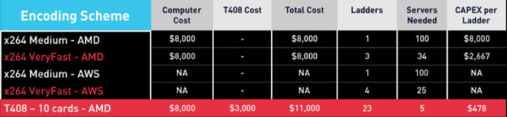 Note that the actual number of ladders that each production scheme can produce at 30fps will vary based upon the encoding ladder and the content, including differences in resolution, the number of rungs, frame rate, and the encoding complexity of the video itself. Still, these factors should impact the three schemas similarly, and encoding even three fewer simultaneous ladders with the T-408-based solution would still enable five servers to produce the 100 target ladders, so there would be no change in the CAPEX, OPEX, and carbon emissions reported below.