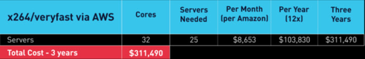 For the x264/very fast production, we priced two alternatives, encoding via AWS and buying servers and running them in a colocation facility. For the T408 production, we priced buying the necessary servers and installing them in a colocation facility. In all three instances, we computed the three-year cost total for CAPEX and OPEX.