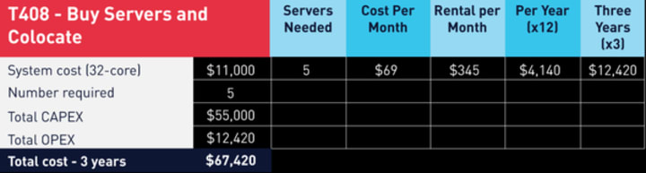 Table 6 shows the three-year cost of purchasing five 32-core servers with ten T408 cards each and running them from a colocation facility. This produced CAPEX of $55,000, OPEX of $12,420, and a three-year total of $67,420.