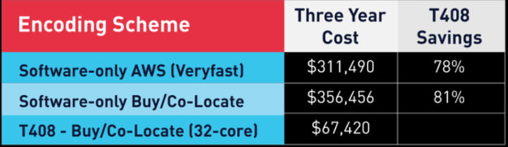 Table 7 compares the three-year cost for all three schemes. The T408-based option represents a 78% cost reduction over encoding with AWS and an 81% savings over purchasing and collocating servers.