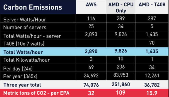 Now we turn our attention to carbon emissions which are presented in Table 8. In the table, the AMD — CPU only and AMD — T408 server watts/hour are actual measurements on the test system during operation. To estimate the AWS server watts/hour, we reduced the CPU-only AMD number by 60%, which is the savings that Amazon claims that Graviton3 CPUs provide over other CPUs. In all three cases, we multiplied this by the number of servers, then hours, days, and years, to compute the three-year power consumption total.