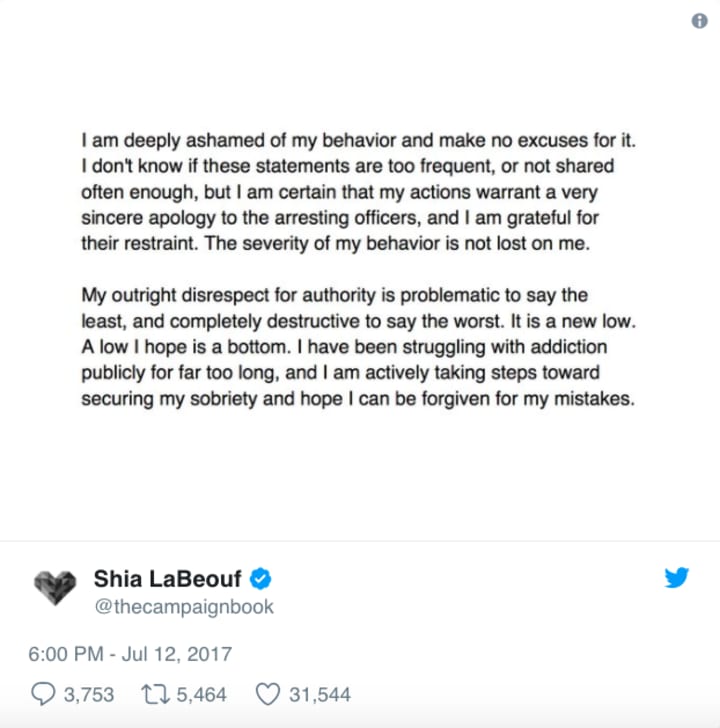 Further footage from the police station shows him slamming other black officers and claiming that one "will go to hell" alongside "a black man arrested me for being white." Despite the incident, it is reported that LaBeouf was back on the set of his latest movie The Peanut Butter Falcon by July 10, but the incident has clearly hit home for the star. Shia is at least hoping to make amends for his recent behavior, and showed that he'd seen the error of his ways in a lengthy tweet to his fans apologizing for his actions: