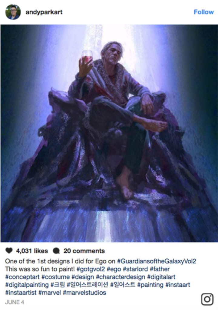Now, some original concept art from the film has made its way online and depicts an early draft of Ego (the Living Planet) before either McConaughey or Russell were attached to the part. As the supervisor at Marvel Studios Visual Development Division, the drawing comes from the mind of brilliant artist Andy Park. Park's previous work involves concept art for the likes Ant-Man, Captain America: Civil War, and the upcoming Thor: Ragnarok, so he clearly knows his stuff. He shared the image on his Instagram and you can check it out below: