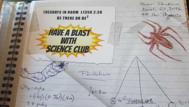 This inside slip clearly shows notes from Peter Parker's physics lesson, and you'll note that the lesson is dated March 22nd, 2016. The sketch of the Winter Soldier arm, which so impressed Peter in Captain America: Civil War, suggests that he's fresh from his trip to Germany. If that's the case, then Spider-Man: Homecoming only happens a few months later, in Fall 2016.