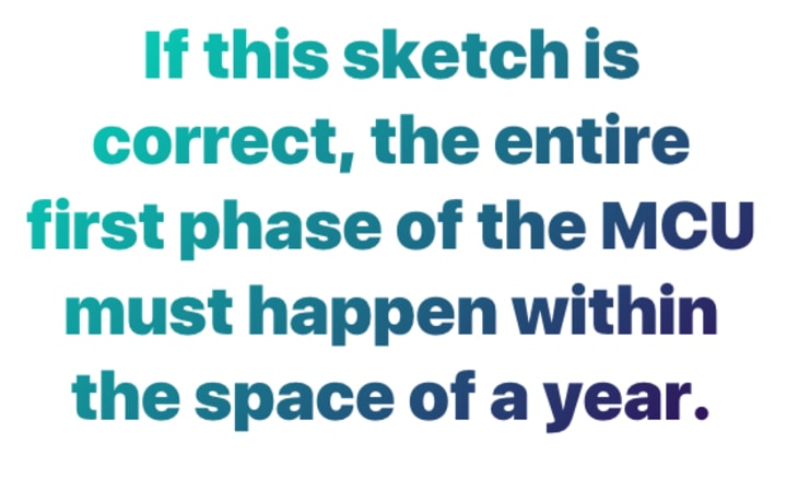If this sketch is correct, the entire first phase of the MCU must happen within the space of a year. Even then, we have to assume that the "eight years" references are actually examples of characters rounding up or down; dialogue in The Avengers clearly states that the Chitauri invasion is set the following year after Thor arrived on Earth.
