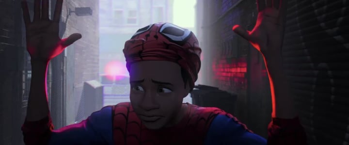 Miles’ dad makes his thoughts known on Spider-Man earlier in the trailer, so it was a given that Miles would be on the wrong side of him sooner or later. The above image shows Miles corner by his old man in an alley, so Miles is probably going to spend a good chunk of the movie shutting his father out due to his crime-fighting. Oh, just before I forget, notice that costume Miles is wearing?...