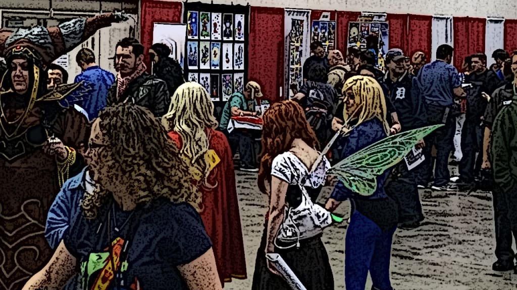I arrived late in the day at the strange makeshift alien outpost. The outpost, nestled in a large hotel ballroom, was only here for the weekend. It was one of the small regional comic conventions, the kind they have every few months in this part of the country. Alien, because it was peopled with the usual array of costumed characters. Crowds at these events usually consist of adorable face-painted kids in homemade costumes, teens too cool to get dressed up, and the hardcore fans in full cosplay. Often the latter are clad in plastic storm trooper uniforms, ghost buster jumpsuits, or federation red and black. These folks don’t come out of character except maybe to pose for a picture.