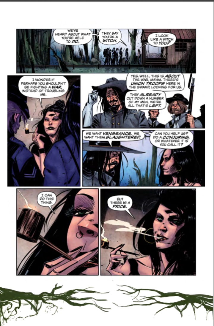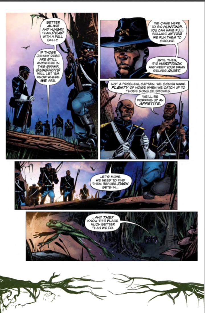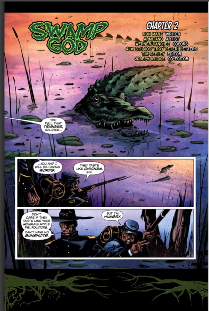 This is a great book and I think the setting, place and time, have a huge impact on how I feel about this. That it is this era lends a greater air of credence to the story because you would find the legends of the swamp witch being more prevalent and believed. They were more superstitious then and to see that play out as we do this issue just reaffirms what we believe of that time. Without being there and only records or journals for guidance the truth is often blurred into legend and myth. By the way for the record the one dude is right they taste like chicken and I make some mean gator grub. I am very much enjoying the way Ron is telling this story. It's intelligent, interesting and the reader comes into this issue already engaged and invested in what’s happening which simply increases exponentially with this issue.