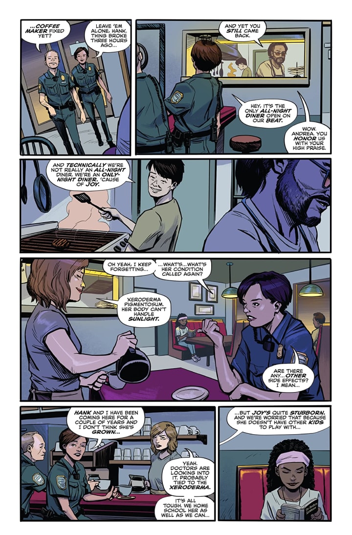 Well this is an absolutely delightful book. I mean the opening is a bit chaotic as it establishes the characters and their frustrations at the predicament they find themselves in. It cannot be easy to be a vampire who doesn’t hunt and lives with their own kind running a night time only diner while masquerading as normal humans, of which one has Xeroderma Pigmentosum meaning she can’t handle daylight. Herein lies the dilemma because staying in one place too long draws attention to the fact that they don’t age. So how do you fight off the boredom of being the undead and flipping burgers while trying to blend in? You take inspiration from superhero films and become one to let off a bunch of steam, that’s how. What could possibly go wrong with that plan?