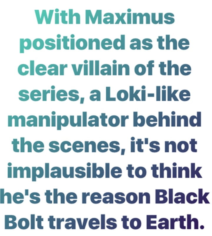 With Maximus positioned as the clear villain of the series, a Loki-like manipulator behind the scenes, it's not implausible to think he's the reason Black Bolt travels to Earth. It would also explain why Black Bolt is with Lockjaw and—so far, at least—none of the other Inhuman cast members have been spotted on set with him yet.