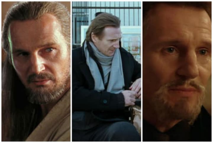 Left; Liam Neeson in Star Wars [Credit: Lucasfilm]. Center; Liam Neeson in Love Actually [Credit: Universal Pictures]. Right; Liam Neeson in Batman Begins. [Credit: DC Comics]