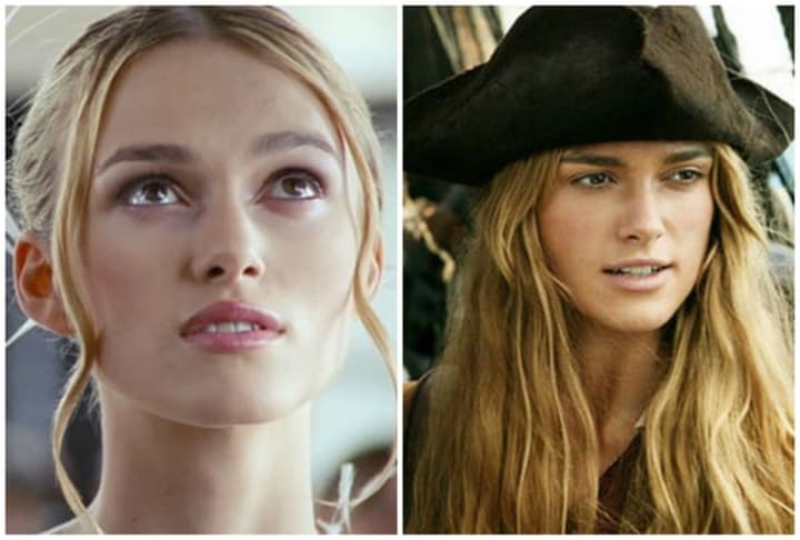 Left; Keira Knightley in Love Actually [Credit: Universal Pictures]. Right; Keira Knightley in Pirates of The Caribbean. [Credit: Walt Disney]