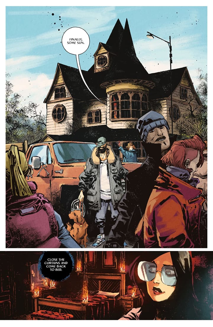 I am blown away by the creativity and imagination that we see within the interiors here. From the house itself lit by candlelight or the creature, who legit makes me shudder, how we see everything is bloody brilliant! The scenes inside the house versus outside the house, her agent in the park for example, nearly look like two separate artists in action and the dichotomy this provides is stunning. How we see backgrounds utilised to enhance and expand the moments as well as how they work within the composition of the panels to bring out the depth perception, sense of scale and the overall sense of size and scope to the story is marvellous. The utilisation of the page layouts, including how we see those piano keys, is bloody phenomenal and the angles and perspective in the panels show a masterful eye for storytelling. The various hues and tones within the colours being utilised to create the shading, highlights and shadow work show a brilliant eye for how colour works and how to maximise their effects.