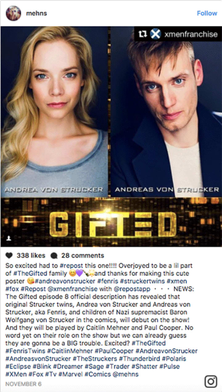 Now, at last, we finally have confirmation of the comic book connection. Caitlin Mehner and Paul Cooper have been cast the original Von Strucker twins, Andrea and Andreas Von Strucker.