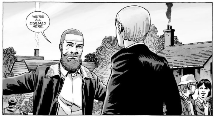 In the comics, it is not Lance, but the Commonwealth's overall leader, Pamela Milton, who makes the trip to Alexandria, after hearing Michonne sing the praises of the community's leader, Rick Grimes. However, having expected a community of comparable size to the Commonwealth, Pamela is at first disappointed in Alexandria, which had recently suffered damage during the Whisperer War, and denounces it as a shithole. She also disagrees with how Alexandria is run. Pamela runs the Commonwealth on a class system, with citizens placed in that system based on their job and social standing before the Apocalypse. Rick, however, believes what people were before no longer matters in the new world. All in Alexandria and it's neighbouring communities are equal, and all put in an equal share of the work to keep things running.