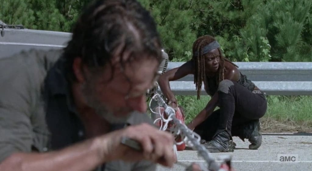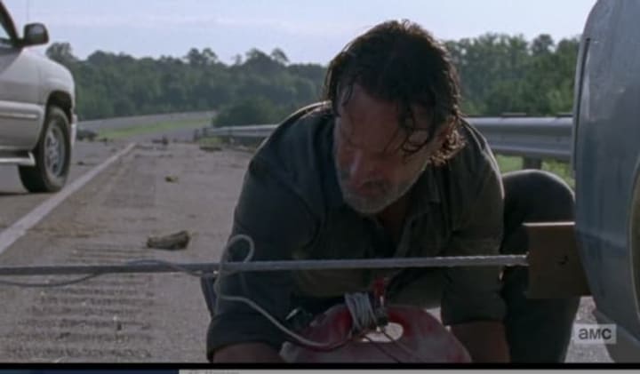 Before Rick and Michonne kill most of the herd of walkers, Rick's group is on a mission to scout the Saviors' camp. On the way, they run into a blockade of cars, deciding to move the vehicles to scout the area from there.