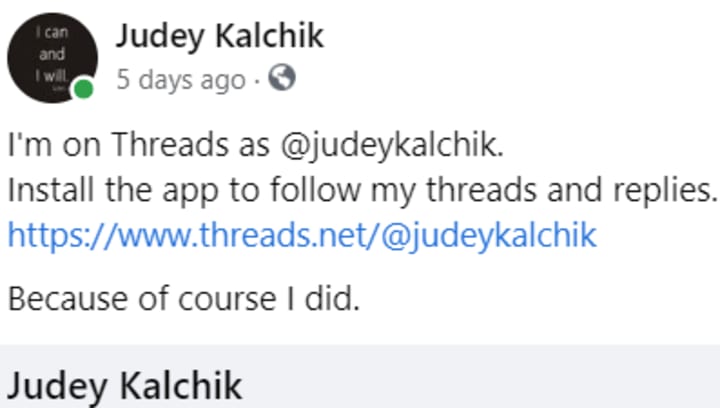 When you are ready for followers share your info with others. I'm going to add my Threads profile to my Vocal profile page. If you join you are welcome to follow me! Here's what I posted on Facebook: