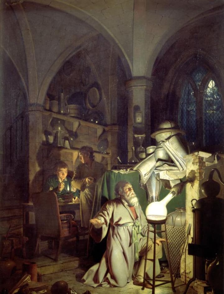 The painting, which dates from 1771, certainly has mystery and magic in it, such as the attitude of the alchemist and the expression of wonder on his face. However, there are also elements of more established science to be seen, such as the scientific instruments and the documents that the alchemist has been consulting or possibly writing.
