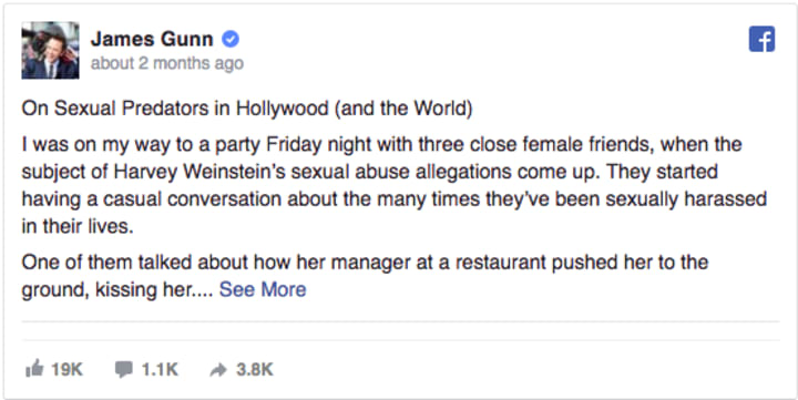 Taking to Facebook under the title “On Sexual Predators in Hollywood (and the World),” the director starts by recalling a recent soirée he went to with three female friends and the tragic stories that they told him. Shocked by what he had heard, Gunn decided to take it upon himself to share their horrifying stories: