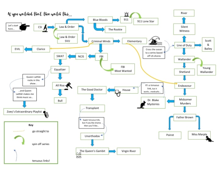 And because who doesn’t love a flow chart, I’ve created one that has a few other shows that highlight my randomness and flighty viewing. There are a couple of medical dramas in there. Now, full disclosure I didn’t watch Grey’s Anatomy so I’m not on the bandwagon over Patrick ‘Swoon’ Dempsey. And that was because I had just watched House – it would have been way too much medicine…says the girl who goes from one cop show to the next…ahem… Yet, if you were a fan of either House or GA, then The Good Doctor and Transplant are brilliant. From Transplant, I’ve made a link to Unorthodox, The Queen’s Gambit and Virgin River. I don’t think I can use the right words to express just how good they are without coming across and over the top and just too effusive. Watch them, they’re good.
