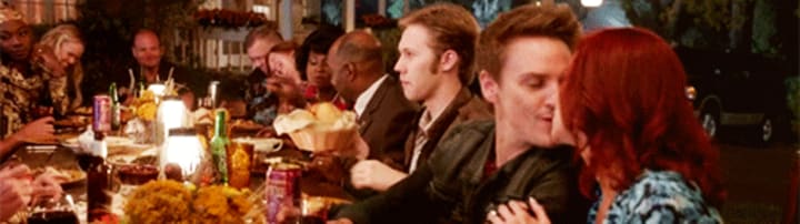 The Thanksgiving at Sookie's! They're in gifs because I love this part so much. It is nice to see them altogether happy and not batshit crazy.