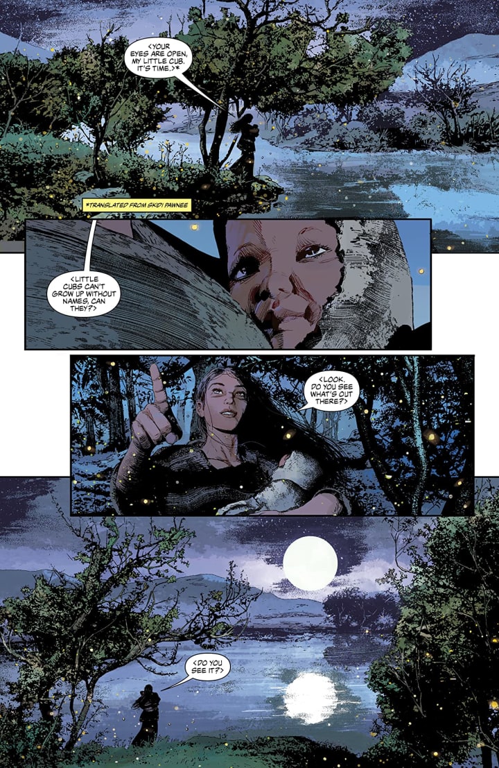 I’m in love with the way that this is being told. The story & plot development that we see through how the sequence of events unfold as well as how the reader learns information is presented exquisitely. The character development that we see through the dialogue, the character interaction as well as how we see them act and react to the situations and circumstances which they encounter which does a magnificent job of showcasing their personalities. With the conversation between Virgil, Two Moons, and Dr. Hatlo or her daughter's interaction with Ike are perfect examples of this. The pacing is amazing and as it takes us through the pages revealing the story we’re enraptured by what we see and learn.