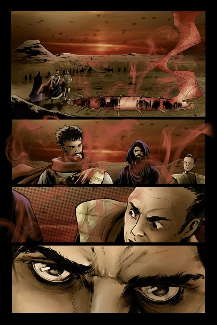 I like the interiors here. There is a lot of shading and that’s the only real negative I got so that should tell you something right off the bat. The linework we see is clean, crisp and sharp and with their varying weights and techniques being utilised to create the detail we see throughout the work, especially in the faces and facial expressions, is extremely well rendered. I’d love to see more backgrounds being utilised because when we do they really enhance and expand the moments beautifully. I mean seeing the relief in the stone makes me want to see more of their architecture. The composition within the panels does a great job in bringing out the depth perception, sense of scale and the overall sense of size and scope to the story. The utilisation of the page layouts and how we see the angles and perspective in the panels show a talented eye for storytelling. The various hues and tones within the colours being utilised to create the shading, highlights and shadow work shows a great eye for how colour works.