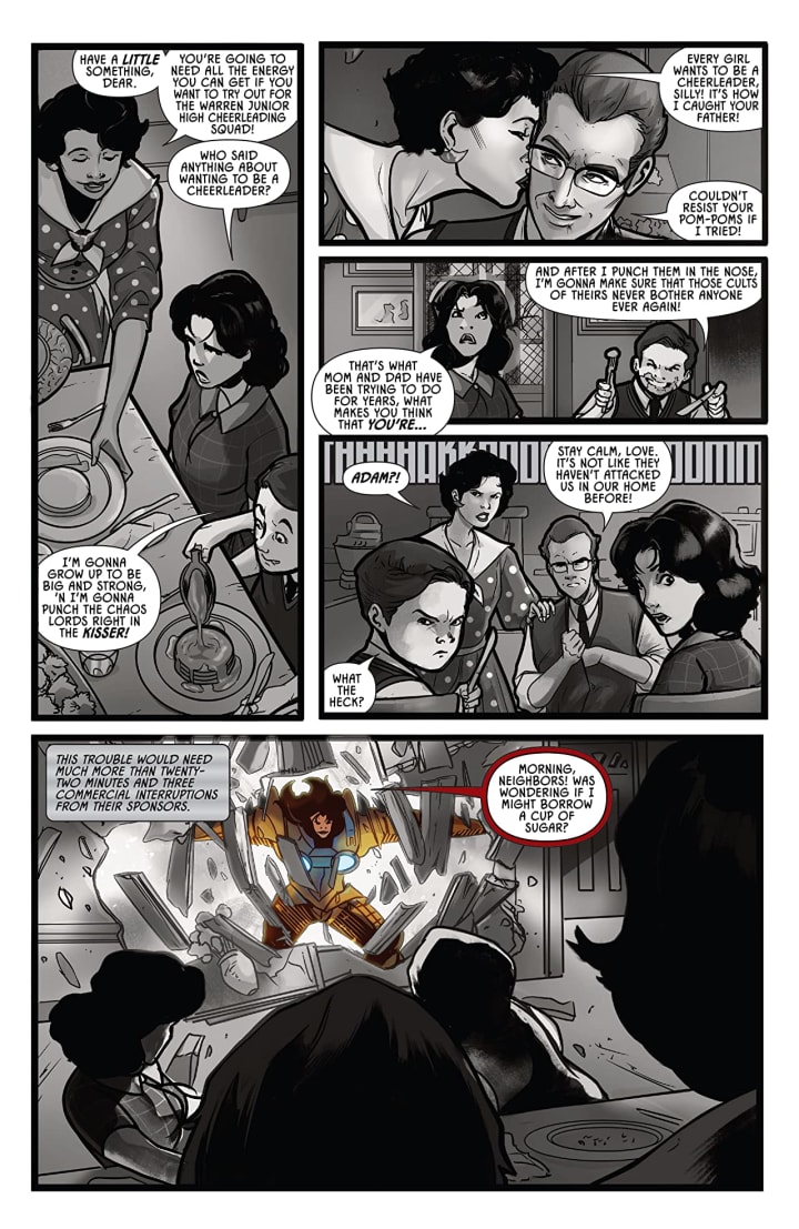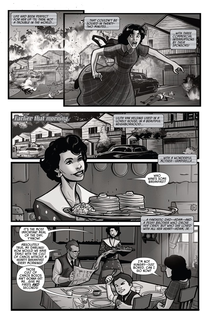 Whomever decided to do the Donna Reed tribute I absolutely bloody adore you! Now that we’ve been introduced to it I’m going to need a four to six issue arc of this family and what they do pure and simple. I’m loving every single moment as the crew traverse the fabrics of space and time dropping in on other versions of Vampirella. The concept is simple and amazing and how we see this coming to life is exceptionally well handled. Even better is the identity of the woman who is chasing them and why she wants to hunt down and destroy all versions of Vampirella. This is the perfect vehicle for die-hard fans and those who want to read her adventures but don’t know where to start.