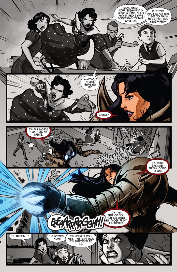 I love, love, love Daniel’s work on the interiors here. The creativity and imagination that we see through each world and how it fits that moment in time and then side by side with each other making the styles more pronounced and more impressive in how they fit together as well. The linework is exquisite and how we see the varying weights and techniques being utilised to create this level & quality of detail within the work is phenomenal. The way backgrounds are utilised to enhance and expand the moments as well as how they work within the composition of the panels bring out the depth perception, sense of scale and the overall sense of size and scope to the story is exceptionally well handled. The utilisation of the page layouts and how we see the angles and perspective in the panels show a masterful eye for storytelling. The various hues and tones within the colours being utilised, including the black & white with gray tones, to create the shading, highlights and shadow work shows a masters eye for how colour works.