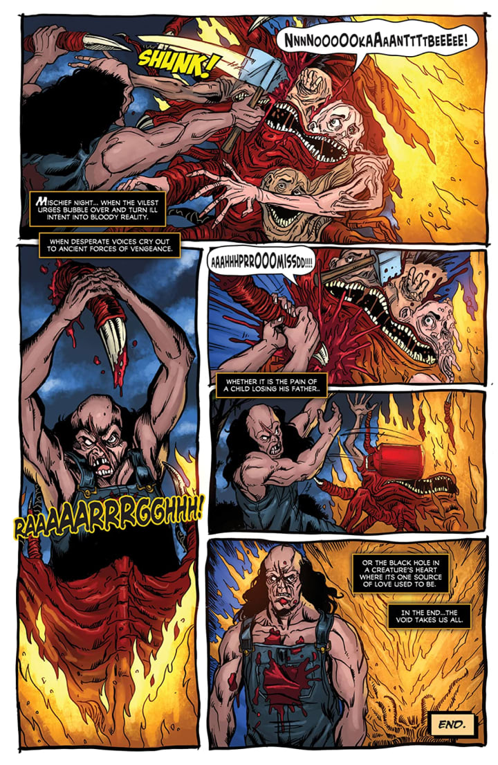While it is the perfect time of year for Hatchet to rear his ugly, and I mean it really is ugly, head and yet I do believe that horror is a year round genre and I’d love to see more of his senseless bloodshed happen much more often, or any and all holidays would work well for me. Still it is because of issues like this one that makes me want to see more and it’s incredibly well put together.