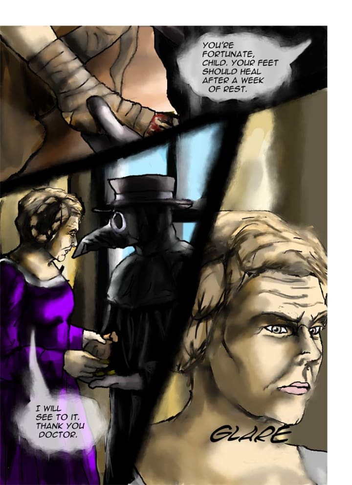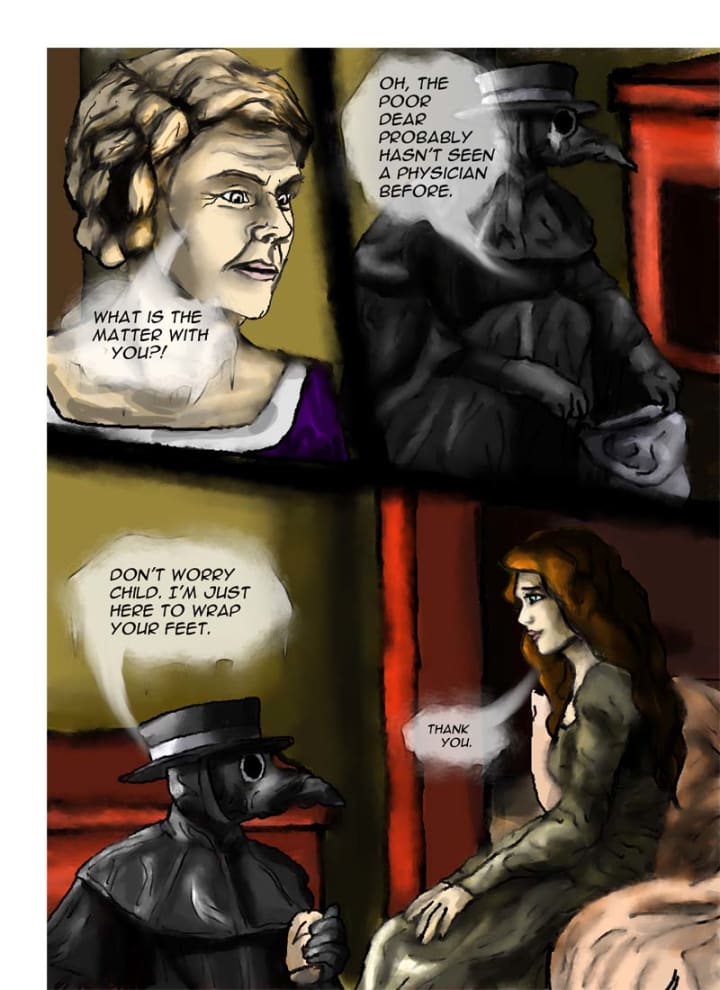 “Come in…” she called. The door opened and her aunt stepped in, wearing a beautiful purple dress and her hair still pulled back tight. If the color wasn’t enough to demonstrate Gertrude’s wealth, the sheen and quality of the fabric surely did. The style she chose for her hair also showed her status with how perfect the braids were coiled on the sides of her head. Not one silver hair was out of place. She looked less harsh than the night before and said, “Gereon told me your feet are in a poor state. I brought a physician to help…” she stepped aside and a man with a crow-like mask on his face entered. He was dressed head to toe in black with a hat, cloak and long dark robes that made her think of the Reaper. He carried a few different satchels on his belt as well as a small cane with the symbol of medicine made of silver on top. He didn’t say a word as he approached, moving smoothly and quietly. Klara’s heart thumped heavily against her chest. She scooted away as he came near and Gertrude frowned heavily.