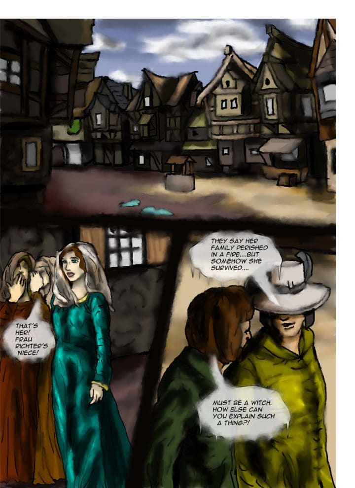 “Sorry.” Klara whispered. Gertrude huffed but didn’t say anything more. They walked outside into a warm and cloudless day and Klara’s happiness flooded back to her. Though she wasn’t sure she liked this town of Munster, she knew she loved the sun. The sky was just starting to turn blue and birds were chirping happily. People were making their way to the center of town where the church bell was starting to chime. Most of them were walking quietly, but as soon as Klara and Gertrude joined them, the whispers instantly started. People muttered about her mysterious past, how her family died in a fire but she somehow survived. They speculated she must be a witch, there was no other reason for it.