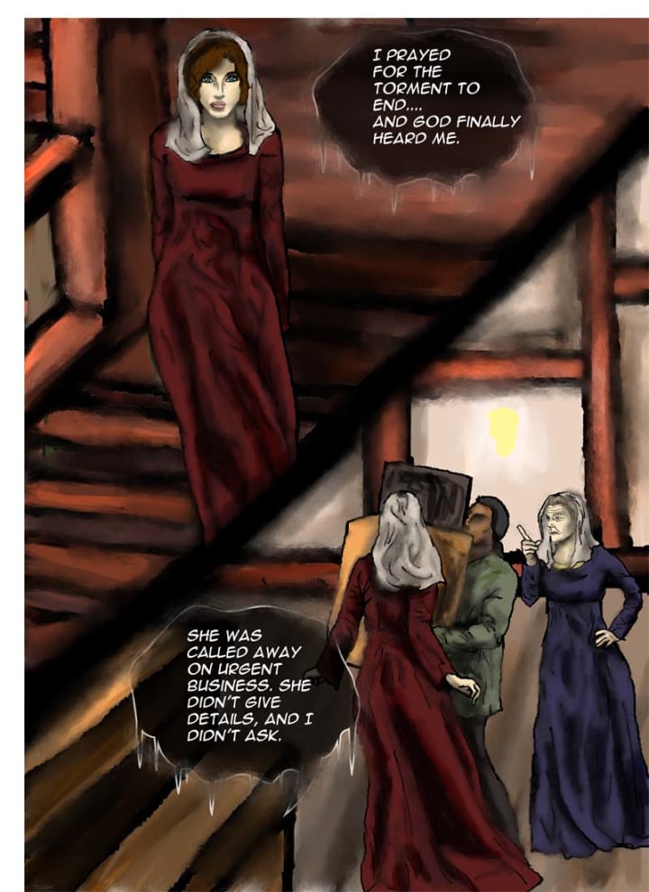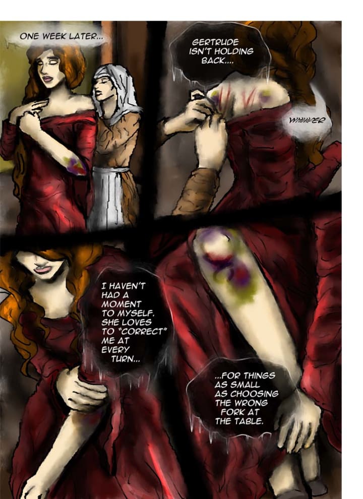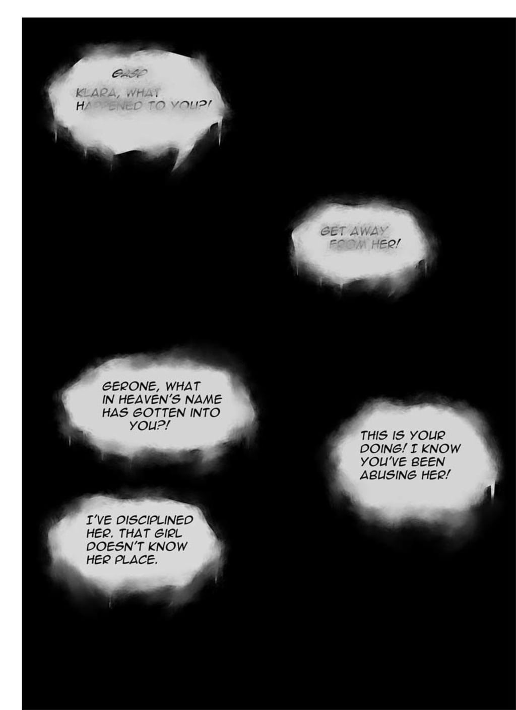 “Please…I beg of you!” Klara cried. Gerone grunted as Gertrude turned to Klara. The girl clasped her hands together and as her aunt raised her hand for another slap across the face, Klara blurted out, “I-I will behave. I will do as you say.” Gertrude lowered her hand and smirked maliciously. She gave Klara a measured look before reaching out to pat Klara on the head. Gerone continued to protest behind Gertrude, shouting for Klara to recant her promise.