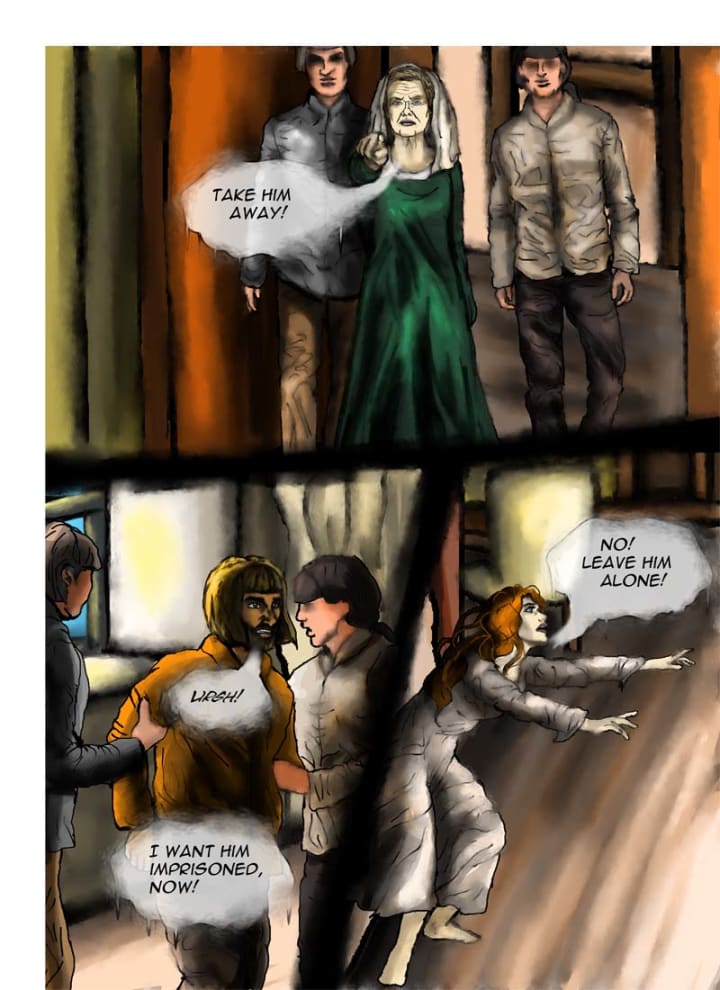 “Take him away!” she snarled, pointing an aged, gnarled finger towards Gerone. “I want him imprisoned, now!” The men complied, marching wordlessly to Gerone and grabbing him roughly by the arms before dragging him away. He thrashed against them all the while but to no avail.