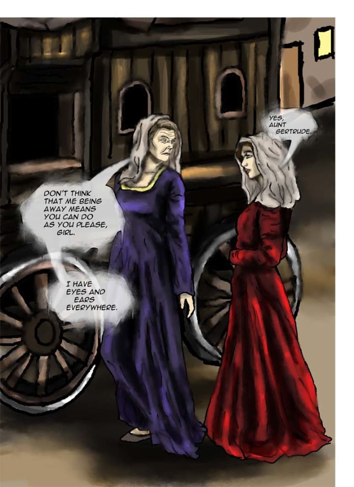 Gertrude came stomping in, her eyes wild with fury at Gerone’s insolence. Two large, muscular men followed, flanking her and preventing any kind of escape as they filled the doorway.