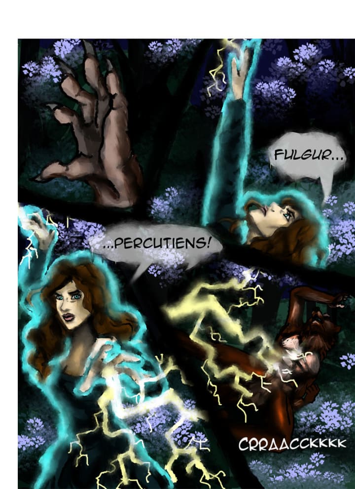 “Fulgur Percutiens!” she shouted. Lightning burst from a sudden storm cloud and struck him in the chest, sending him flying into the forest. She panted heavily, sweat dripping down her forehead. “Carina, go, get help…” she whispered, trying to regain her strength. Carina hesitated. “Now!” Klara shouted. Carina staggered off as quickly as she could, getting far enough before Gerrick returned, snarling angrily.
