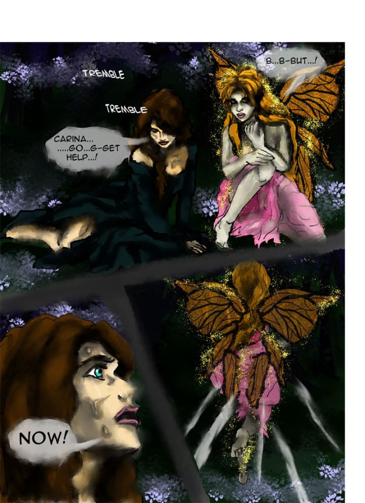 Carina flinched, shutting her eyes. But the sword never came close to her and she heard Gertrude gasp in pain. The fairy and wolf starred in stunned surprise as Klara sunk the sword into Gertrude’s torso. Gertrude grunted in anger and surprise then threw Klara back with a blast of dark magic. “Pathetic, worthless girl!” she drew out the sword and it disappeared, no wound left in her body.
