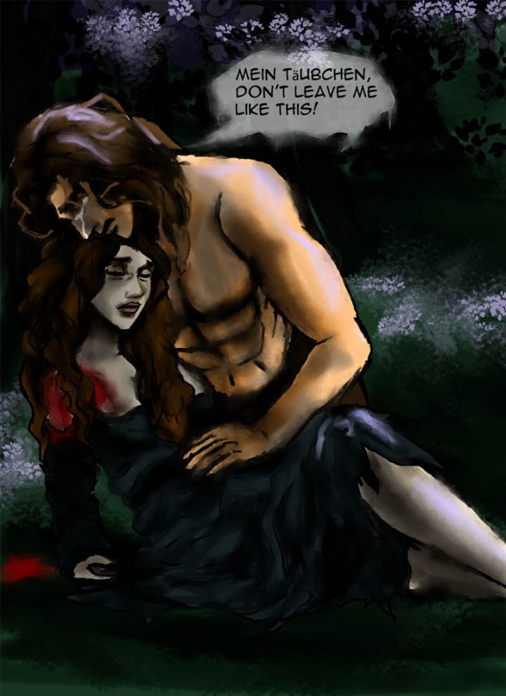 “Klara get out of here!” Randolf commanded, struggling to restrain Gertrude. He looked at her for a moment and Gertrude took that instant to stab him with a small silver knife, hitting him in the lung. He crumpled, gasping for breath as the wound burned around the silver.