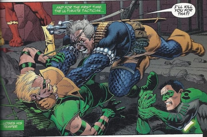 Deathstroke's role in the DC comics universe broadened when he went head-to-head with the entire Justice League during the Identity Crisis miniseries. Giving an idea of Deathstroke's skills, he almost took the team down, but forgot his strategy when Green Arrow shot an arrow into Deathstroke's right eye. Enraged, Deathstroke launched a furious attack on the archer, but the mindless rage meant he made tactical errors. He was defeated, but still escaped, and this began a long-running vendetta against Green Arrow.