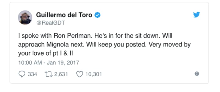 If you've been keeping up, a few weeks ago Guillermo del Toro announced he's moving forward with another installment in his line of #Hellboy movies. Del Toro went to Twitter with a poll to find out how many fans would be interested in a third Hellboy movie and an enormous response was followed by the director announcing his next step, which is to speak with comic creator, #MikeMignola on making Hellboy 3 a reality.