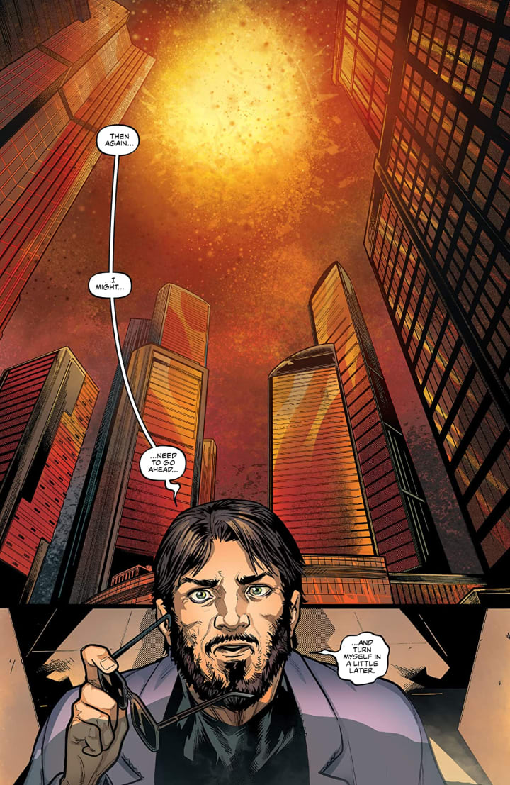 Before I get into the interiors I wanna say this. With the amount of times the suit has shut down we should have seen the full monty here on several occasions oh and why isn’t he hairy as all get out? He’s from a time when hairy chests, backs and buttocks were the norm and honestly he isn’t who’d care if he were hairy. Get with it people heh. The linework is fantastic and how we see the varying weights and techniques being utilised to create the attention to detail that we see throughout the book is fantastic! How we see backgrounds utilised to enhance and expand the moments while also working within the composition of the panels to bring out the depth perception, sense of scale and the overall sense of size and scope to the story. The utilisation of the page layouts and how we see the angles and perspective in the panels shows a really rather remarkable eye for storytelling. The various hues and tones within the colours being utilised to create the shading, highlights and shadow work shows this sensational eye for how colour works.