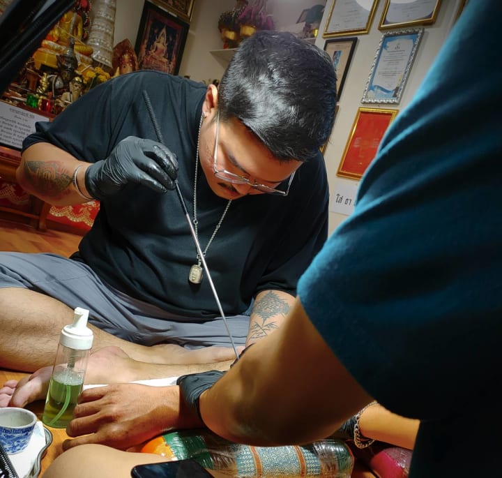 The origins of Sak Yant tattoos trace back hundreds, possibly thousands, of years to ancient animist and Brahmanist spiritual practices that predate the widespread adoption of Buddhism in the region. Historically, these tattoos were created by monks, ascetics, and shamans who acted as spiritual guides and protectors. The process of tattooing was and remains a sacred ritual, often accompanied by prayers, mantras, and ceremonies that imbue the ink with mystical energy. This ritualistic aspect distinguishes Sak Yant from ordinary tattoos, marking it as a form of spiritual armor. This knowledge is transmitted across generations, sometimes within family lines and other times through the teachings of master practitioners in specialized schools. An example of passing on knowledge down the generation will be 'Baan Neramit' by Arjan Top.
