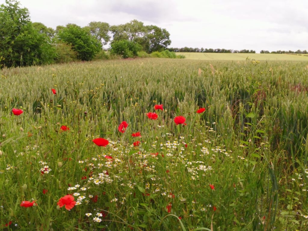 (Photo by author of a field of red poppies and white daisies in the Normandy countryside with a grouping of trees in the mid-ground and agricultural fields in the background.)