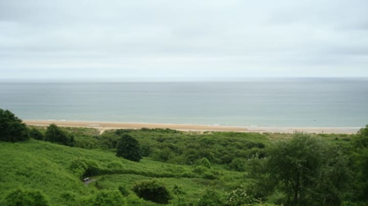 (Photo by author of the view of Omaha Beach from the American Cemetery. Green rolling hills covered in trees and shrubbery cascade to the line where the sand meets the shore. In the background, the blue-gray ocean meets an overcast horizon.)