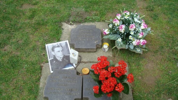 (Photo by author of Michael Wittmann’s gravesite. There are three flat, black headstones, a bouquet of red flowers, a bouquet of purple and white flowers, two candles, rosary beads, and a photograph of Wittmann.)