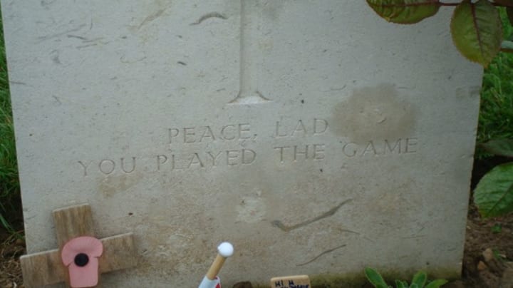 (Photo by author of the bottom half of Corporal F.E.J. Day’s headstone that reads, “PEACE, LAD, YOU PLAYED THE GAME.” A small wooden cross with a faded red poppy containing a black dot in the center and unidentifiable trinkets are leaning against the headstone.)
